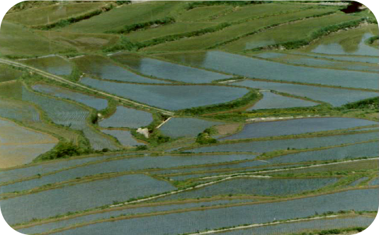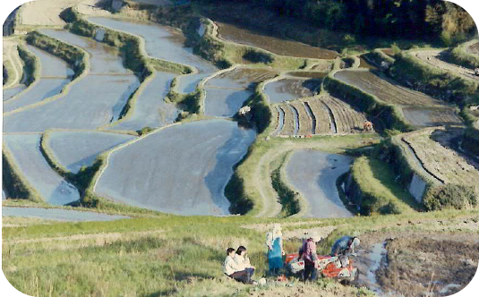 湯谷の地形は北に湯谷ケ岳、南にも山並み、東西に谷があり湯谷川が流れ、丘の麓に集落が寄り添っています。